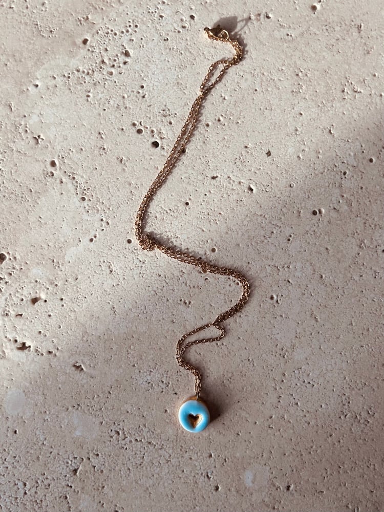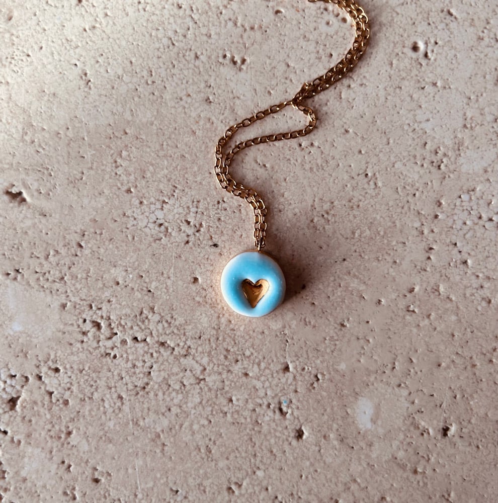 Collana con ciondolo in ceramica modellato e decorato a mano con terza cottura di oro lustro.