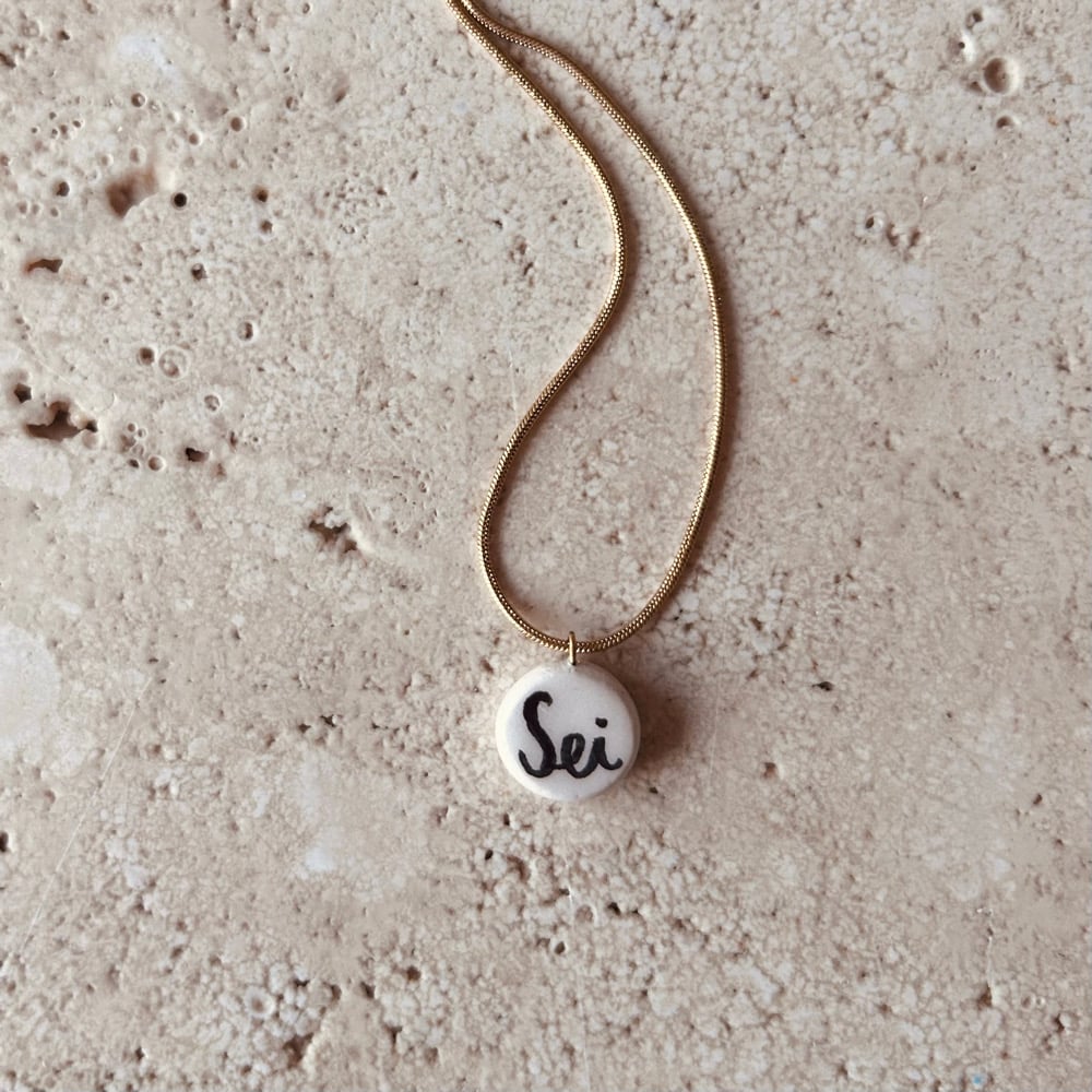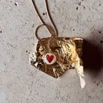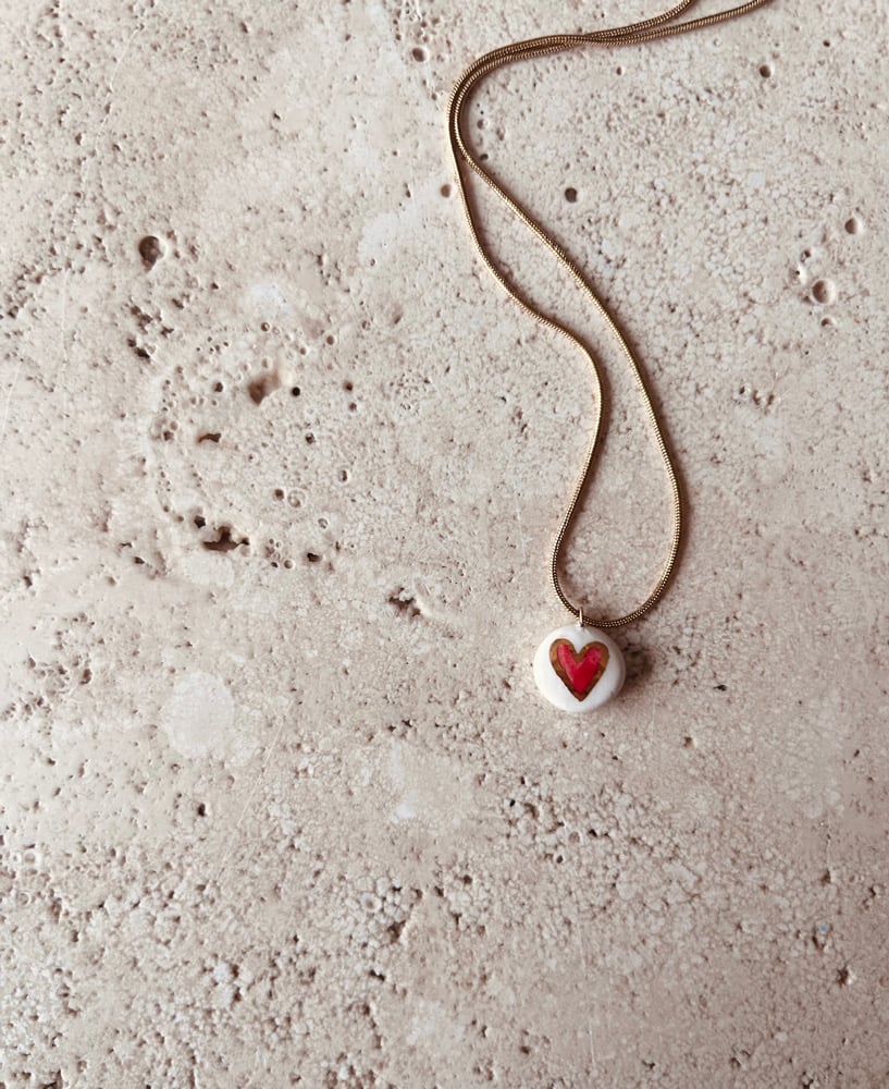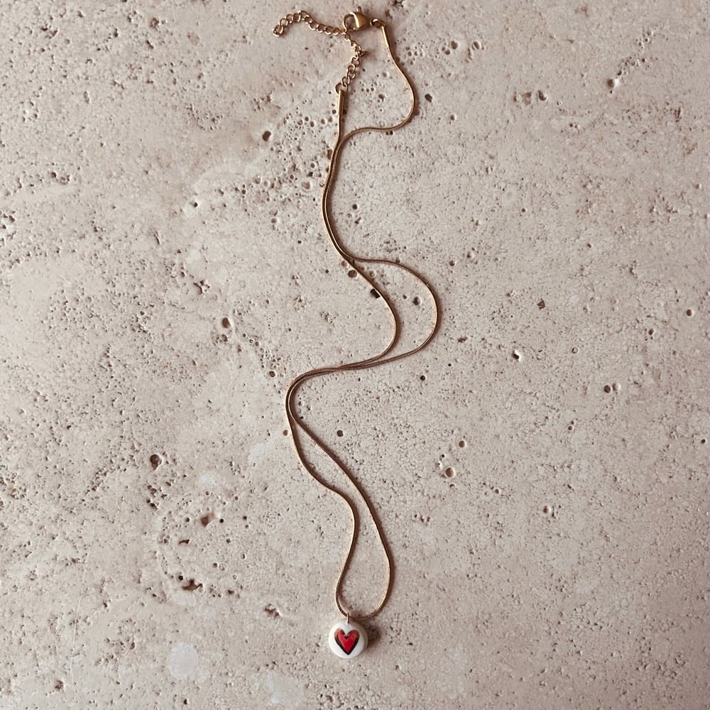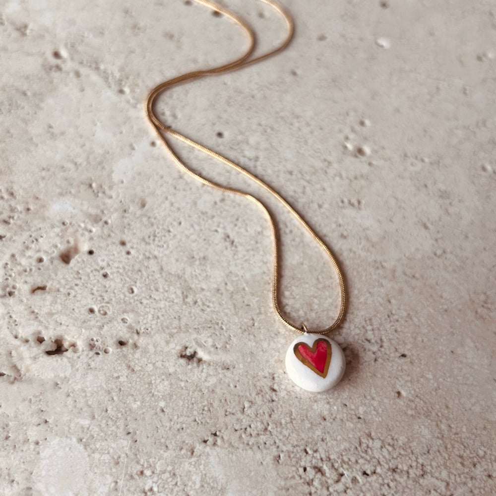 Collana con ciondolo cuore in ceramica modellato e decorato a mano e terza cottura di oro lustro.