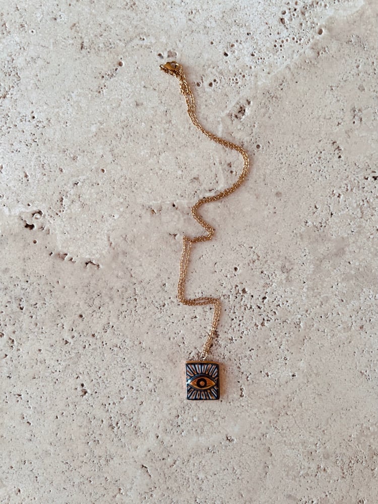Collana con ciondolo modellato e decorato a mano in porcellana, double - face, occhio in rilievo, cuore rosso.