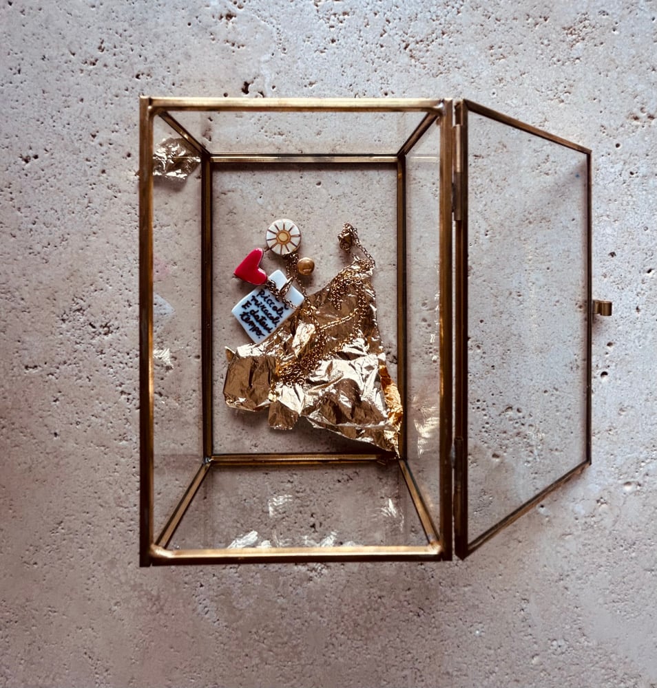 Questi quattro ciondoli in porcellana sono modellati e decorati a mano con terza cottura in oro lustro.